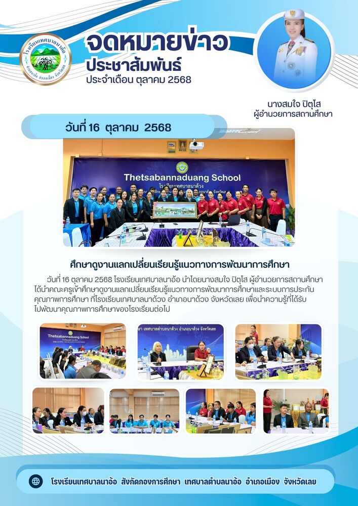วันที่ 16 ตุลาคม 2568 โรงเรียนเทศบาลนาอ้อ นำโดยนางสมใจ ปิตุโส ผู้อำนวยการสถานศึกษาได้นำคณะครูเข้าศึกษาดูงานแลกเปลี่ยนเรียนรู้แนวทางการพัฒนาการศึกษาและระบบการประกันคุณภาพการศึกษา ที่โรงเรียนเทศบาลนาด้วง อำเภอนาด้วง จังหวัดเลย เพื่อนำความรู้ที่ได้รับไปพัฒนาคุณภาพการศึกษาของโรงเรียนต่อไป |
