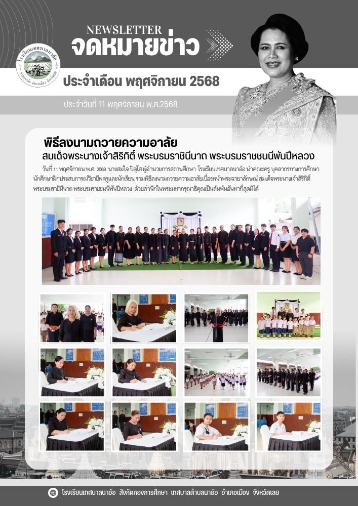 | วันที่ 11 พฤศจิกายน พ.ศ. 2568 นางสมใจ ปิตุโส ผู้อำนวยการสถานศึกษา โรงเรียนเทศบาลนาอ้อ นำคณะครู บุคลากรทางการศึกษา นักศึกษาฝึกประสบการณ์วิชาชีพครูและนักเรียน ร่วมพิธีลงนามถวายความอาลัยเบื้องหน้าพระฉายาลักษณ์ สมเด็จพระนางเจ้าสิริกิติ์ พระบรมราชินีนาถ พระบรมราชชนนีพันปีหลวง ด้วยสำนึกในพระมหากรุณาธิคุณเป็นล้นพ้นอันหาที่สุดมิได้ |