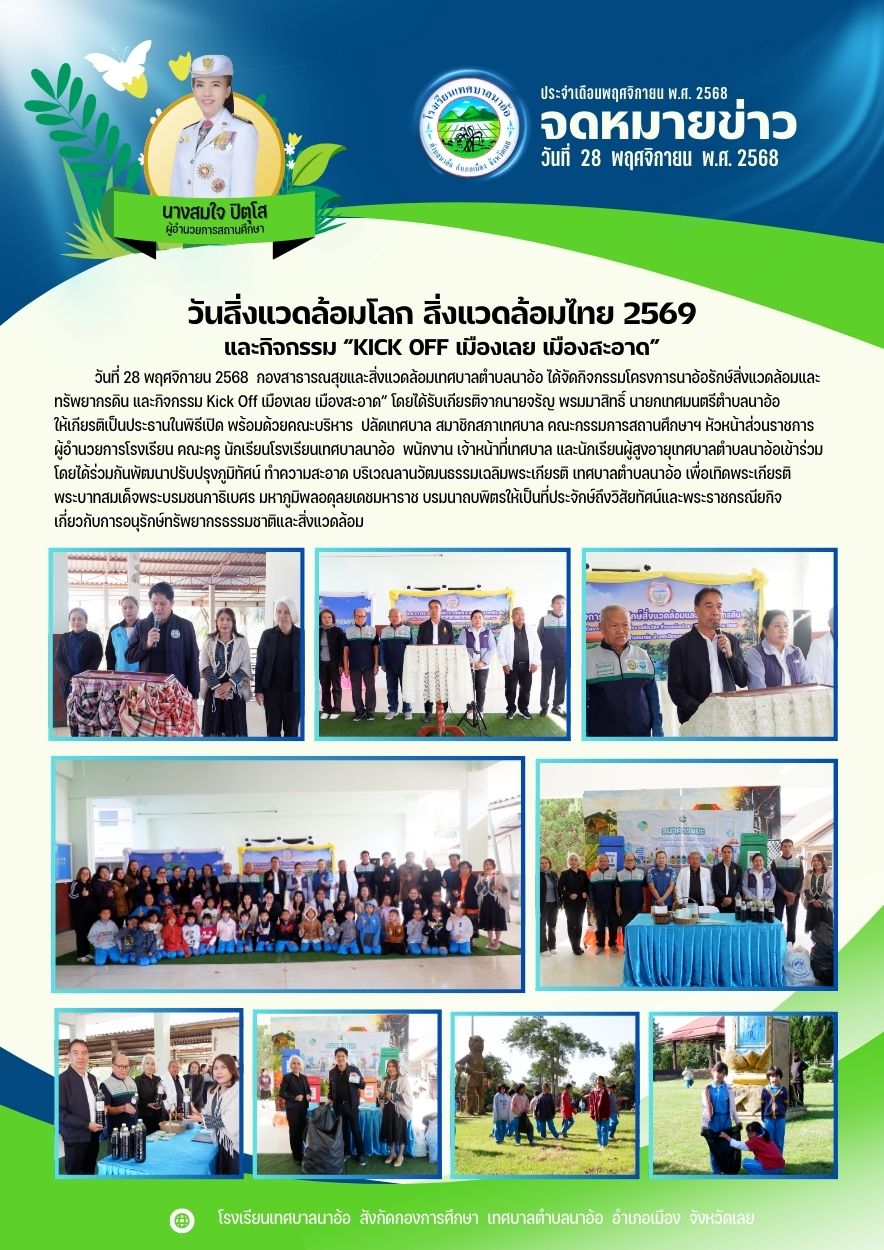 วันที่ 28 พฤศจิกายน 2568 กองสาธารณสุขและสิ่งแวดล้อมเทศบาลตำบลนาอ้อ ได้จัดกิจกรรมโครงการนาอ้อรักษ์สิ่งแวดล้อมและทรัพยากรดิน และกิจกรรม Kick Off เมืองเลย เมืองสะอาด” โดยได้รับเกียรติจากนายจรัญ พรมมาสิทธิ์ นายกเทศมนตรีตำบลนาอ้อ ให้เกียรติเป็นประธานในพิธีเปิด พร้อมด้วยคณะบริหาร ปลัดเทศบาล สมาชิกสภาเทศบาล คณะกรรมการสถานศึกษาฯ หัวหน้าส่วนราชการผู้อำนวยการโรงเรียน คณะครู นักเรียนโรงเรียนเทศบาลนาอ้อ พนักงาน เจ้าหน้าที่เทศบาล และนักเรียนผู้สูงอายุเทศบาลตำบลนาอ้อเข้าร่วม โดยได้ร่วมกันพัฒนาปรับปรุงภูมิทัศน์ ทำความสะอาด บริเวณลานวัฒนธรรมเฉลิมพระเกียรติ เทศบาลตำบลนาอ้อ เพื่อเทิดพระเกียรติ พระบาทสมเด็จพระบรมชนกาธิเบศร มหาภูมิพลอดุลยเดชมหาราช บรมนาถบพิตรให้เป็นที่ประจักษ์ถึงวิสัยทัศน์และพระราชกรณียกิจเกี่ยวกับการอนุรักษ์ทรัพยากรธรรมชาติและสิ่งแวดล้อม |
