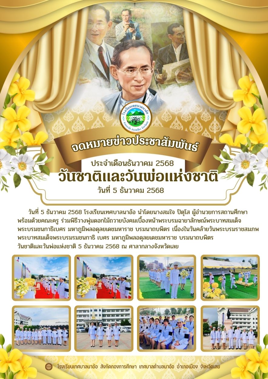 วันที่ 5 ธันวาคม 2568 โรงเรียนเทศบาลนาอ้อ นำโดยนางสมใจ ปิตุโส ผู้อำนวยการสถานศึกษา พร้อมด้วยคณะครู ร่วมพิธีวางพุ่มดอกไม้ถวายบังคมเบื้องหน้าพระบรมฉายาลักษณ์พระบาทสมเด็จ พระบรมชนกาธิเบศร มหาภูมิพลอดุลยเดชมหาราช บรมนาถบพิตร เนื่องในวันคล้ายวันพระบรมราชสมภพพระบาทสมเด็จพระบรมรมชนกาธิ เบศร มหาภูมิพลอดุลยเดชมหาราช บรมนาถบพิตร วันชาติและวันพ่อแห่งชาติ 5 ธันวาคม 2568 ณ ศาลากลางจังหวัดเลย |