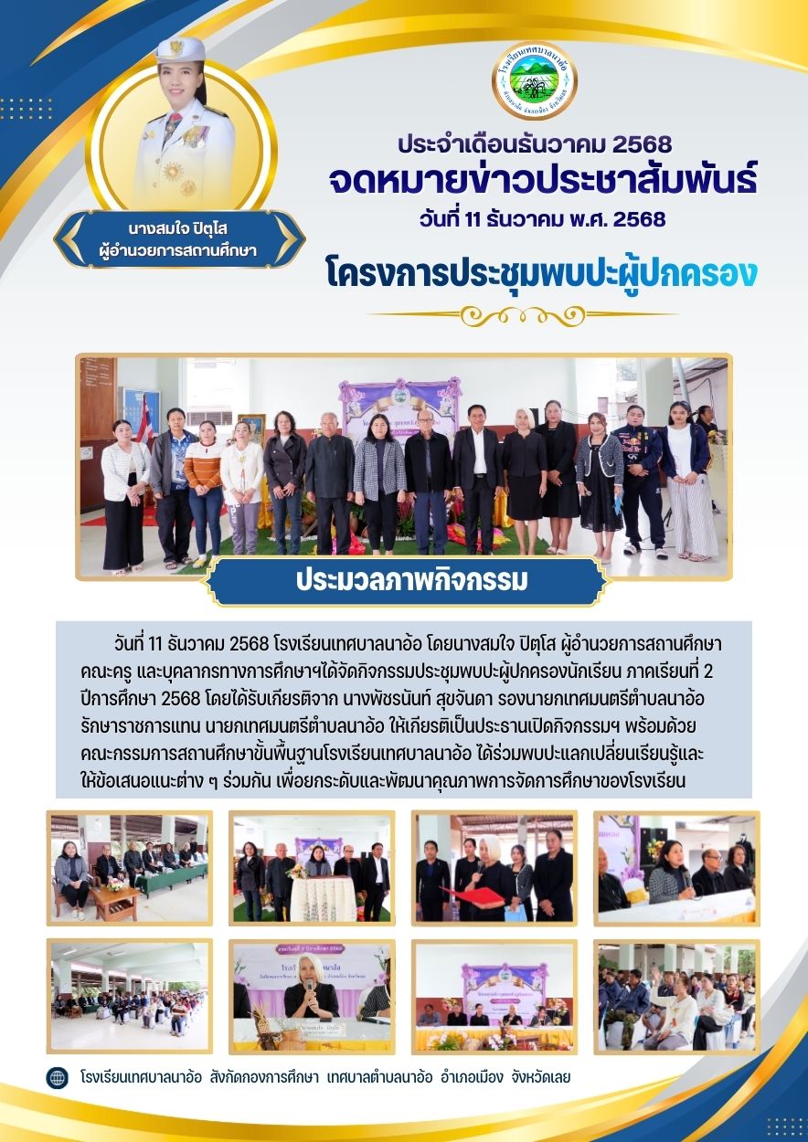 วันที่ 11 ธันวาคม 2568 โรงเรียนเทศบาลนาอ้อ โดยนางสมใจ ปิตุโส ผู้อำนวยการสถานศึกษา คณะครู และบุคลากรทางการศึกษาฯได้จัดกิจกรรมประชุมพบปะผู้ปกครองนักเรียน ภาคเรียนที่ 2 ปีการศึกษา 2568 โดยได้รับเกียรติจาก นางพัชรนันท์ สุขจันดา รองนายกเทศมนตรีตำบลนาอ้อ รักษาราชการแทน นายกเทศมนตรีตำบลนาอ้อ ให้เกียรติเป็นประธานเปิดกิจกรรมฯ พร้อมด้วย คณะกรรมการสถานศึกษา