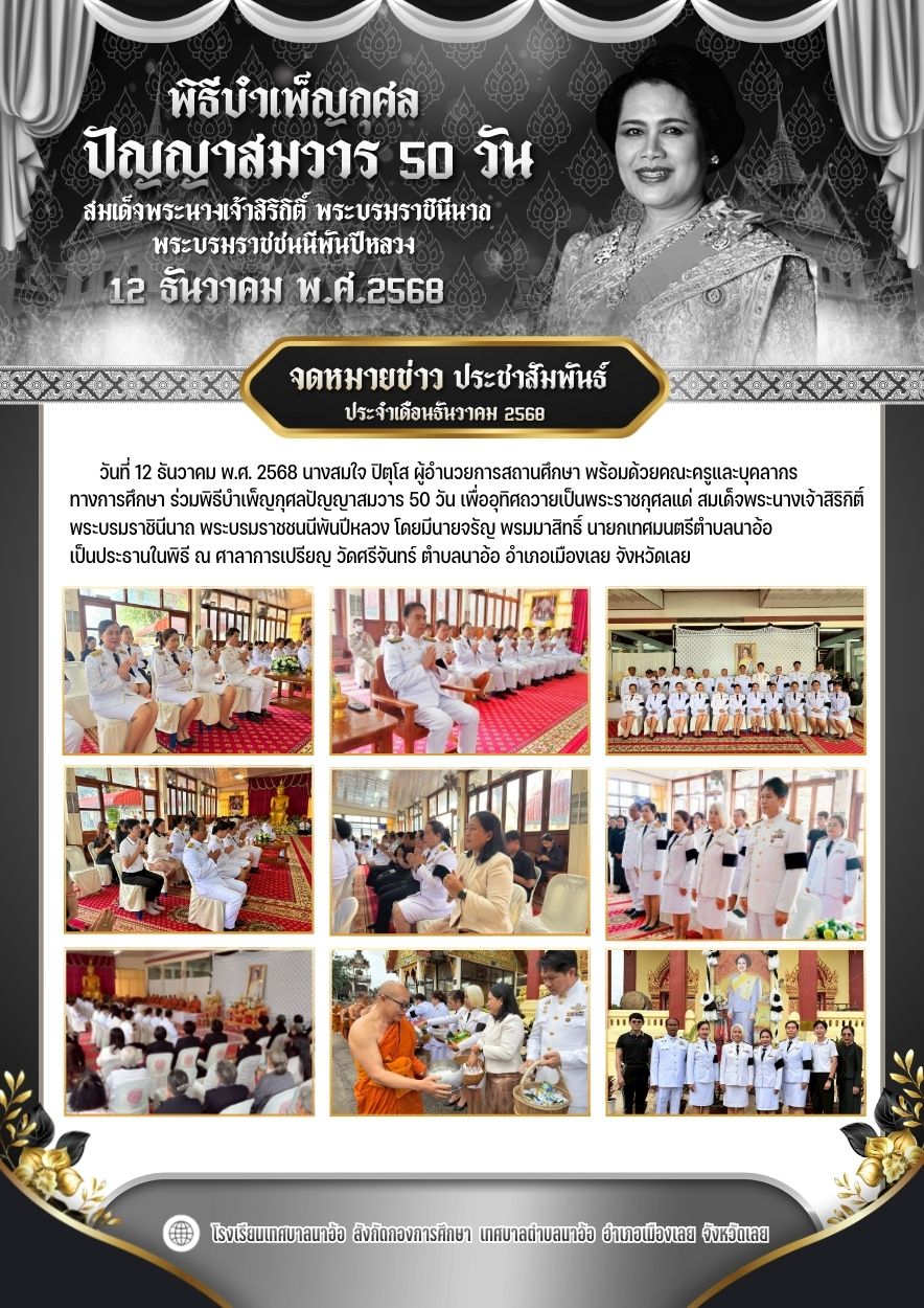 วันที่ 12 ธันวาคม พ.ศ. 2568 นางสมใจ ปิตุโส ผู้อำนวยการสถานศึกษา พร้อมด้วยคณะครูและบุคลากรทางการศึกษา ร่วมพิธีบำเพ็ญกุศลปัญญาสมวาร 50 วัน เพื่ออุทิศถวายเป็นพระราชกุศลแด่ สมเด็จพระนางเจ้าสิริกิติ์ พระบรมราชินีนาถ พระบรมราชชนนีพันปีหลวง