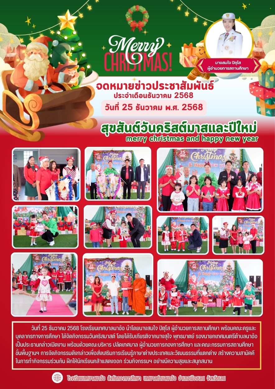 วันที่ 25 ธันวาคม 2568 โรงเรียนเทศบาลนาอ้อ นำโดยนางสมใจ ปิตุโส ผู้อำนวยการสถานศึกษา พร้อมคณะครูและบุคลากรทางการศึกษา ได้จัดกิจกรรมวันคริสมาสต์ โดยได้รับเกียรติจากนางสุใจ พุทธมาตย์ รองนายกเทศมนตรีตำบลนาอ้อเป็นประธานกล่าวเปิดงาน พร้อมด้วยคณะบริหาร ปลัดเทศบาล ผู้อำนวยการกองการศึกษา และคณะกรรมการสถานศึกษาขั้นพื้นฐานฯ การจัดกิจกรรมดังกล่าวเพื่อส่งเสริมการเรียนรู้ภาษาต่างประเทศและวัฒนธรรมที่แตกต่าง สร้างความสามัคคีในการทำกิจกรรมร่วมกัน ฝึกให้นักเรียนกล้าแสดงออก ร่วมกิจกรรมฯ อย่างมีความสุขและสนุกสนาน |