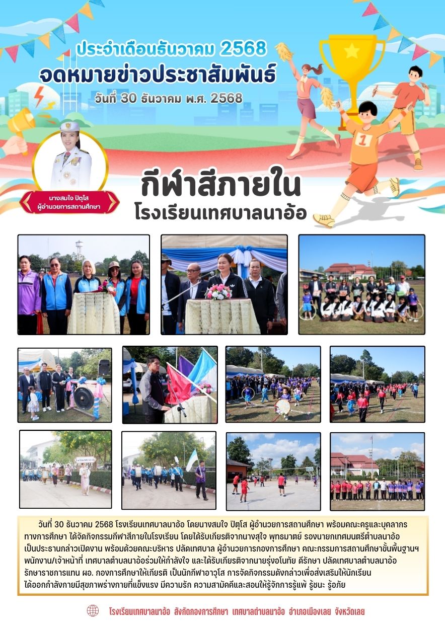 วันที่ 30 ธันวาคม 2568 โรงเรียนเทศบาลนาอ้อ โดยนางสมใจ ปิตุโส ผู้อำนวยการสถานศึกษา พร้อมคณะครูและบุคลากรทางการศึกษา ได้จัดกิจกรรมกีฬาสีภายในโรงเรียน โดยได้รับเกียรติจากนางสุใจ พุทธมาตย์ รองนายกเทศมนตรีตำบลนาอ้อ เป็นประธานกล่าวเปิดงาน พร้อมด้วยคณะบริหาร ปลัดเทศบาล ผู้อำนวยการกองการศึกษา คณะกรรมการสถานศึกษาขั้นพื้นฐานฯ พนักงาน/เจ้าหน้าที่ เทศบาลตำบลนาอ้อร่วมให้กำลังใจ และได้รับเกียรติจากนายรุ่งอโนทัย ดีรักษา ปลัดเทศบาลตำบลนาอ้อ รักษาราชการแทน ผอ. กองการศึกษาให้เกียรติ เป็นนักกีฬาอาวุโส การจัดกิจกรรมดังกล่าวเพื่อส่งเสริมให้นักเรียนได้ออกกำลังกายมีสุขภาพร่างกายที่แข็งแรง มีความรัก ความสามัคคีและสอนให้รู้จักการรู้แพ้ รู้ชนะ รู้อภัย |